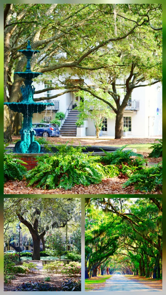 Moss swaying from the live oaks and water trickling from the fountain in Savannah’s Lafayette Square … true bliss.